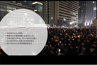 さらに2015年12月の「日韓合意」を機に韓国の空気が刻々と変化しているのを覚えています。2016年の最初の水曜デモで尹美香さんが「まだ2015年が終わっていない」と話されたのを覚えていますが、この年に革命が韓国では起きましたよね。2016年、これは私が2016年12月31日にキャンドル・デモに参加した時に撮った写真なんですけども、光化門(カンファムン)の前で何十万人もの人たちが集まって、社会を変えようとしていた。
